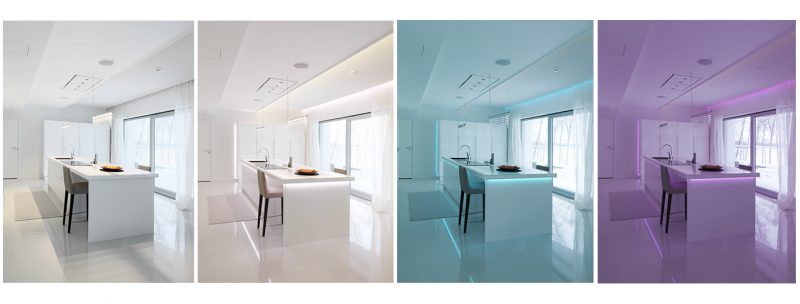 Kitchen lit up in different shades. Light can affect both colour temperature and colours, from weekday mornings to festive evenings. There are several light source options, white light 3000K and 4000K and also options with color temperature control CCT. In addition, RGBW can also be included, which brings colours available.