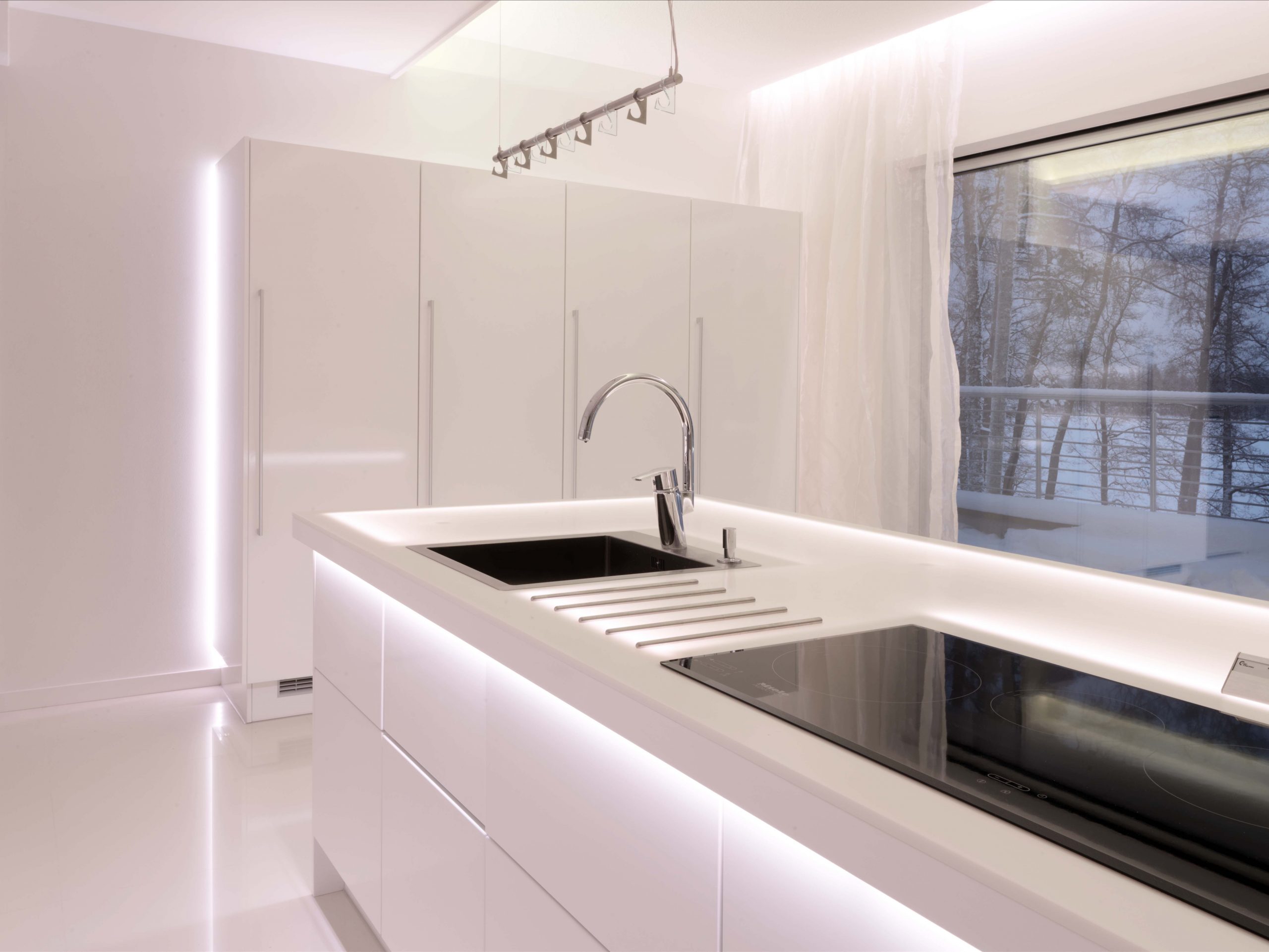 Kitchen lit up in different shades. Light can affect both colour temperature and colours, from weekday mornings to festive evenings. There are several light source options, white light 3000K and 4000K and also options with color temperature control CCT. In addition, RGBW can also be included, which brings colours available.