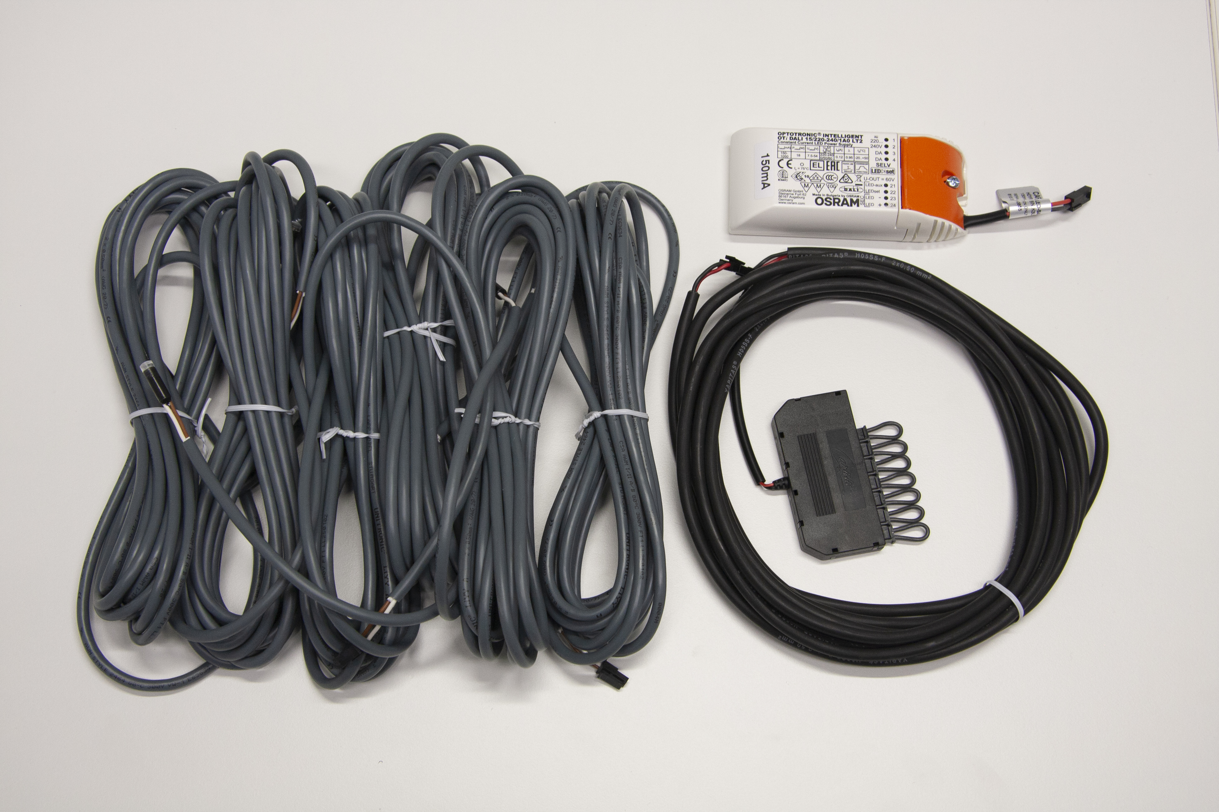 Comme bloc d’alimentation Osram OTi 15 DALI qui permet de varier l’intensité de la série soit avec le bouton-poussoir, soit avec le régulateur Dali.