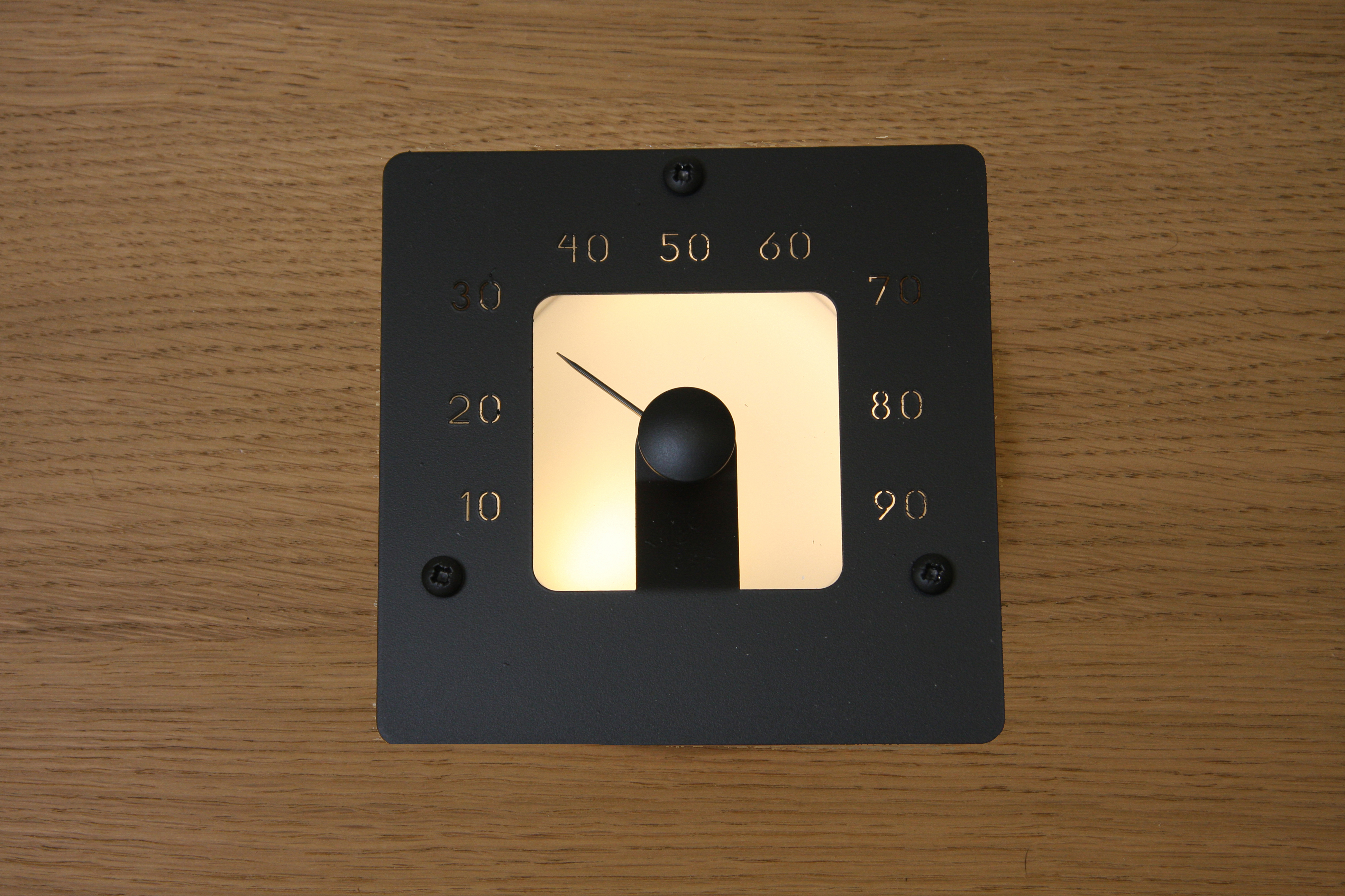 Устанавливается при обшивке сауны панелями. Размер гигрометра 120 х 120 мм, глубина ниши для установки 40 мм. Выступает над поверхностью обшивки на 20 мм. Крепится к стене тремя винтами из нержавеющей стали, входящими в комплект.