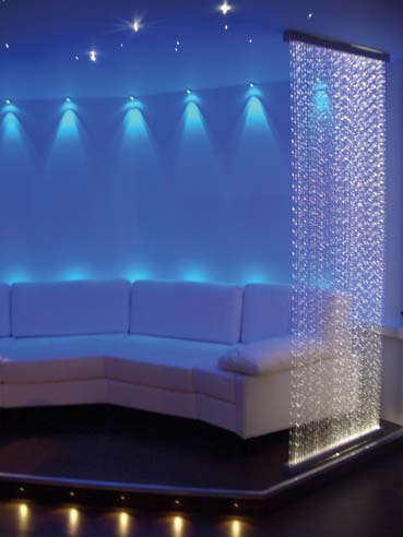Pirta Flat -valokuituverho on asennusvalmis kokonaisuus, jossa kuidut on asennettu valaisinrunkoon ja kristallit kuitujen päihin.