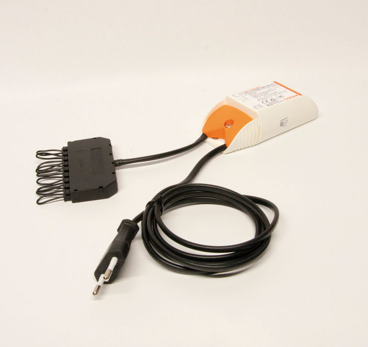 Muuntajasetti 1W/350mA ledeille, sarjaankytkentämoduuleilla, himmennys syöttöjännitteestä.